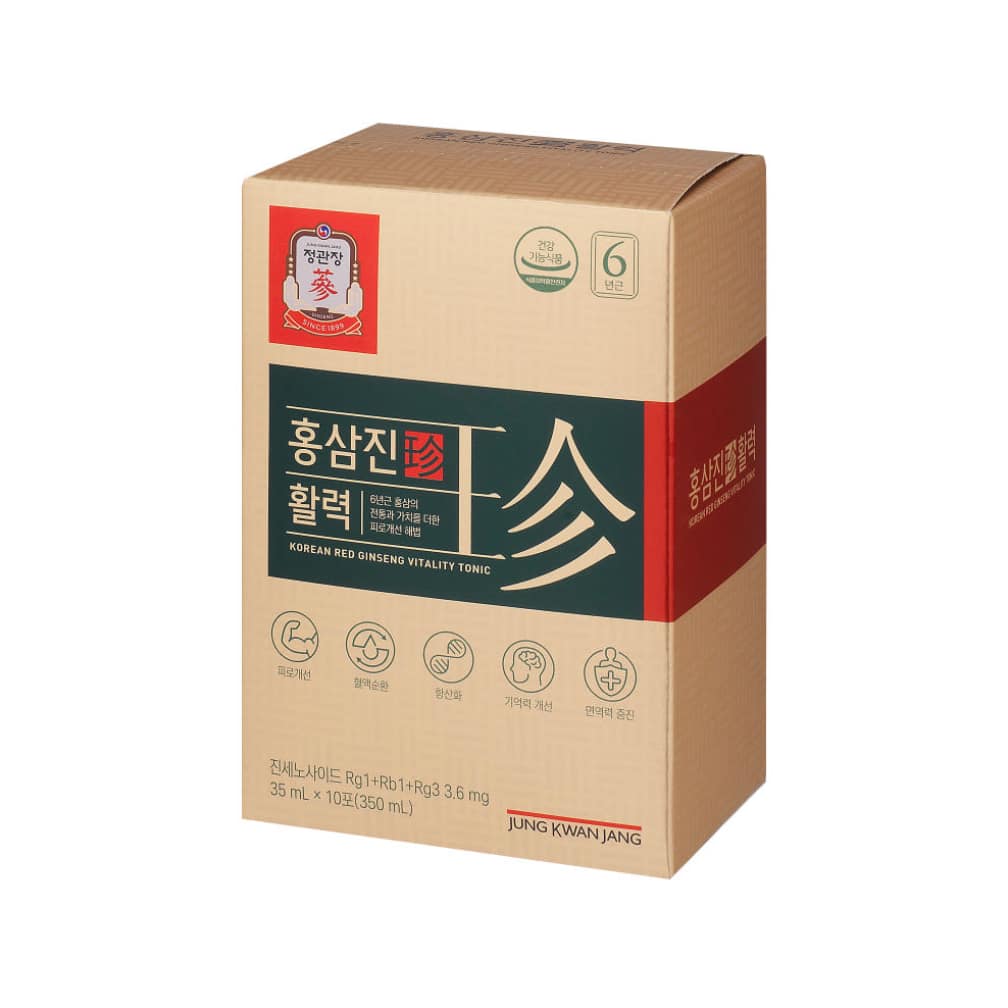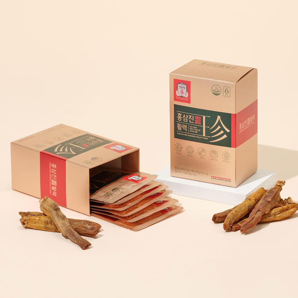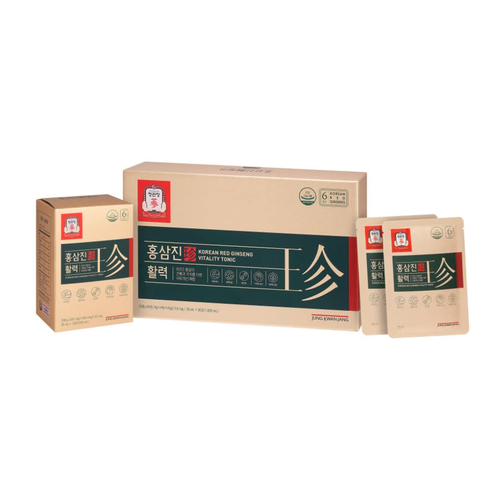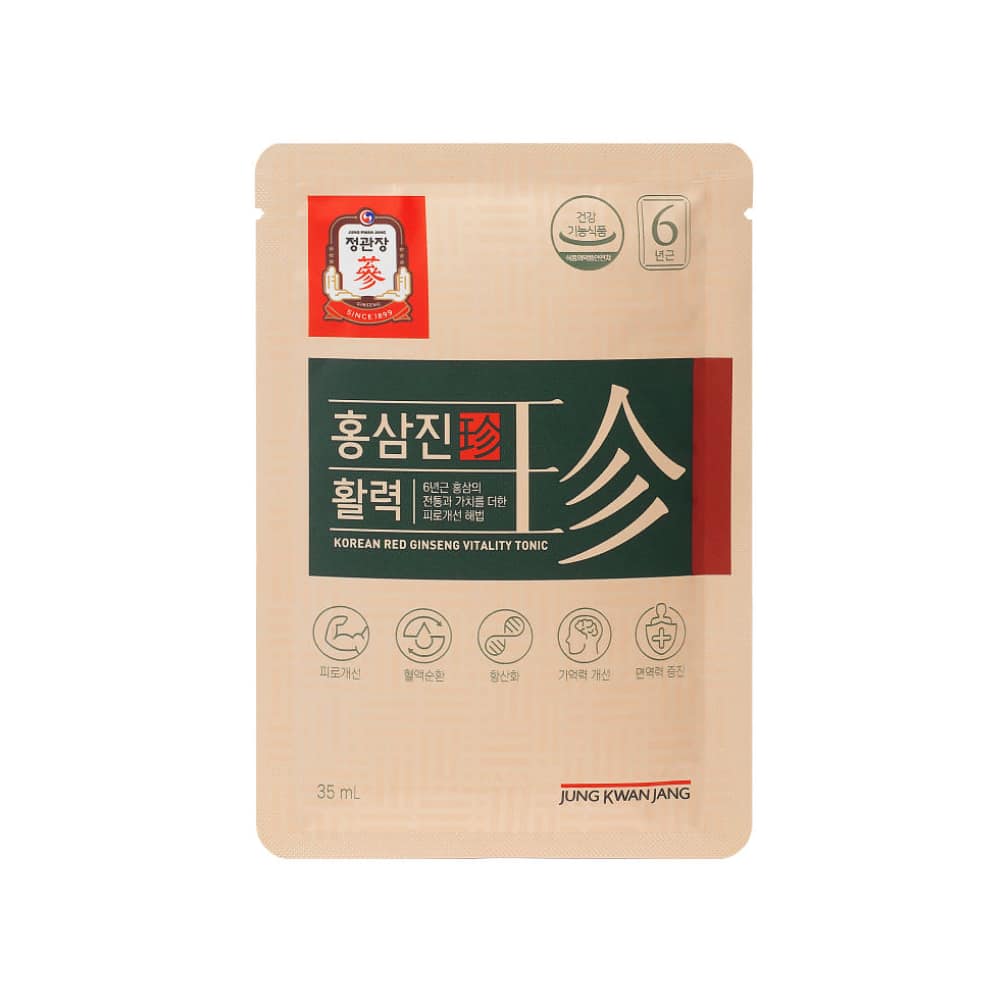 CheongKwanJang HongSamJin Vitality Red Ginseng with Velvet Antler is a premium Korean red ginseng health supplement designed to support daily vitality and overall wellness. Made with carefully selected 6-year-old Korean red ginseng, velvet antler and traditional herbal ingredients, this convenient liquid pouch delivers rich flavor and balanced nutrition in one easy daily serving. Backed by over 120 years of expertise from Korea Ginseng Corporation, HongSamJin Vitality Red Ginseng with Velvet Antler helps you stay energized and focused in your everyday life.