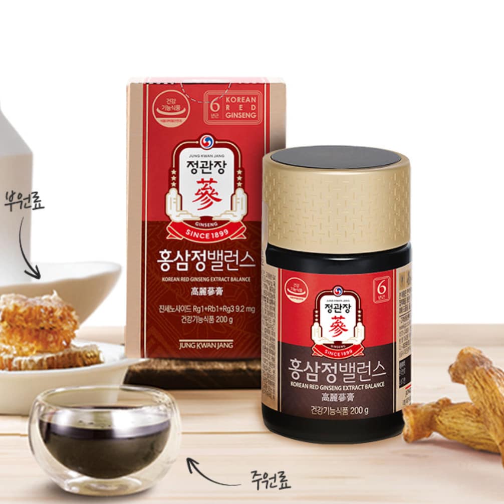 A smoother take on classic red ginseng. CheongKwanJang’s Korean Red Ginseng Extract Balance blends 70% 6-year red ginseng concentrate with Korean honey, ginger syrup, and propolis for a milder taste—perfect for daily wellness without the bitterness.