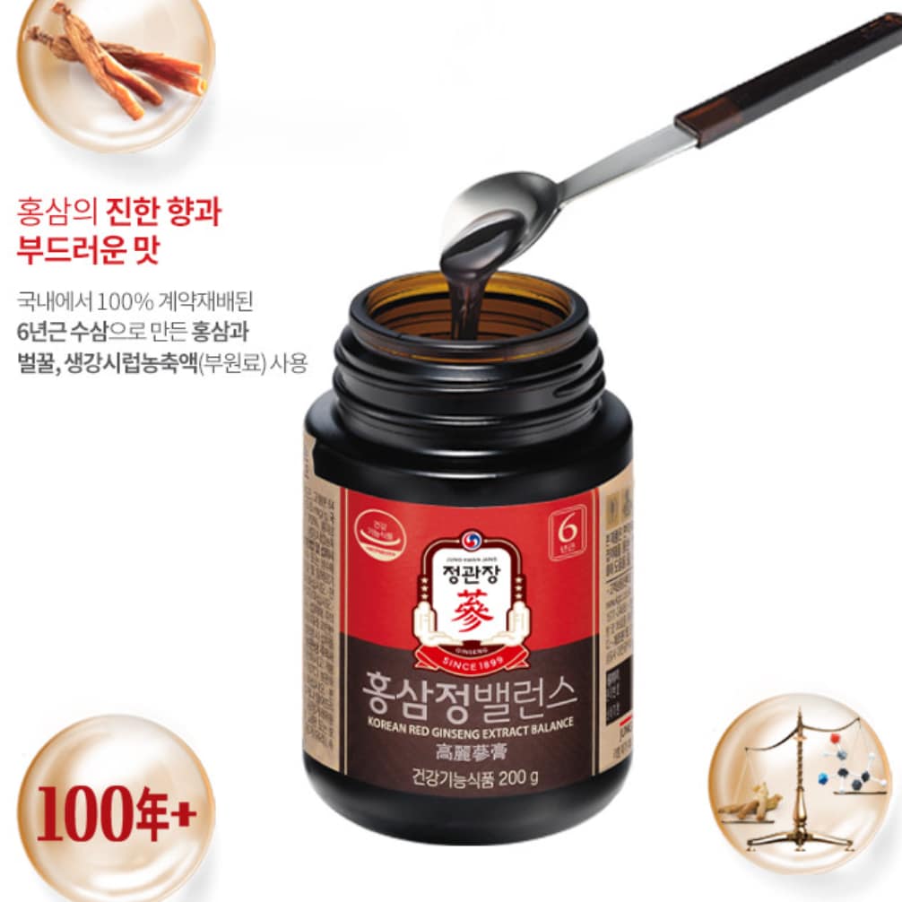 A smoother take on classic red ginseng. CheongKwanJang’s Korean Red Ginseng Extract Balance blends 70% 6-year red ginseng concentrate with Korean honey, ginger syrup, and propolis for a milder taste—perfect for daily wellness without the bitterness.