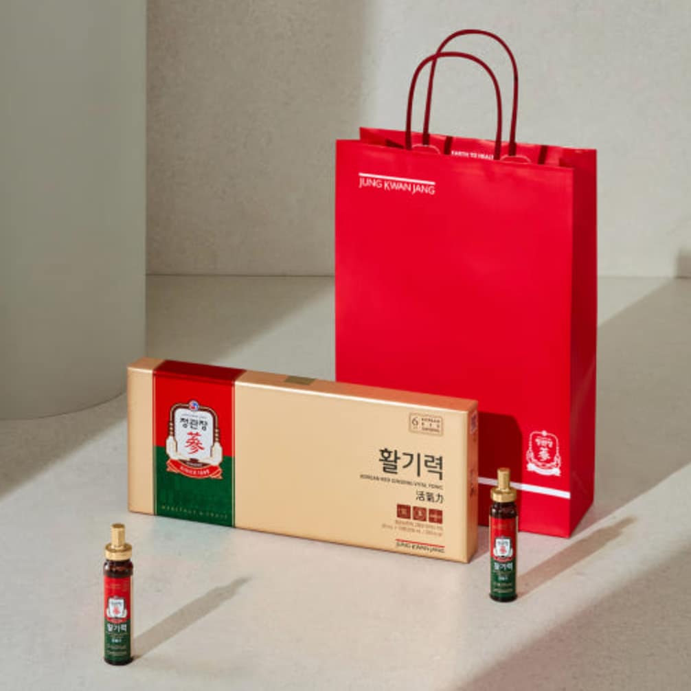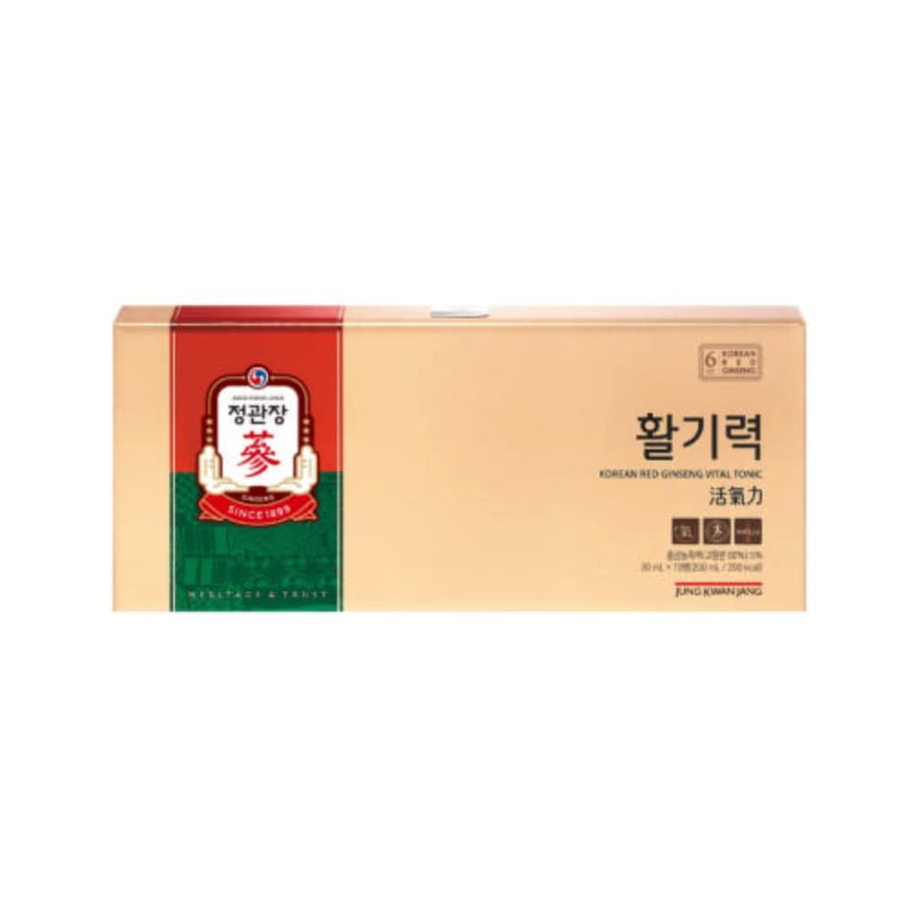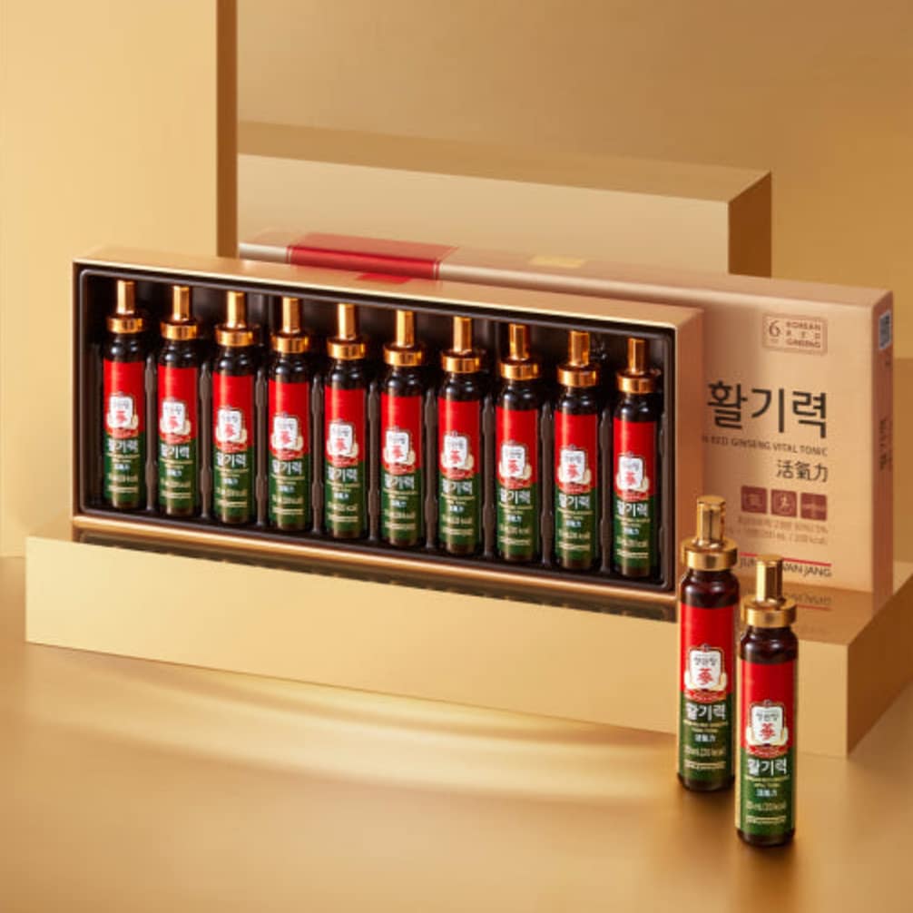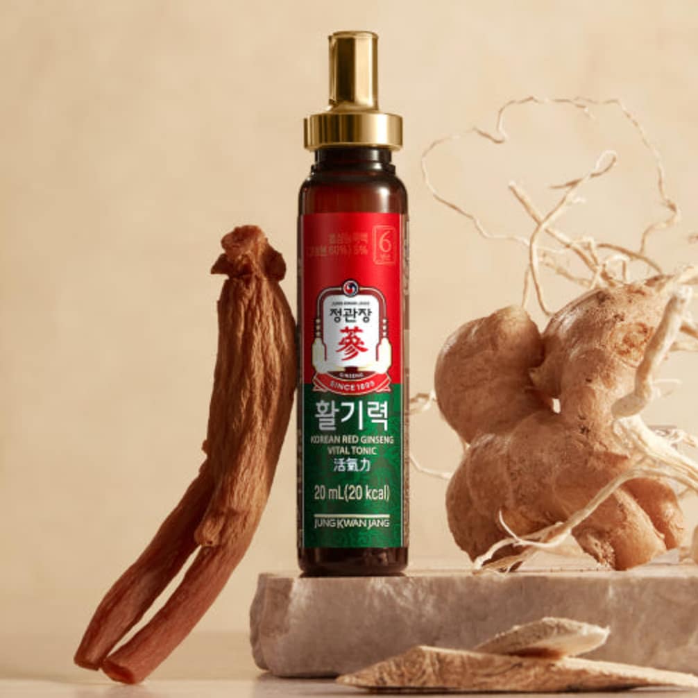 CheongKwanJang Vital Tonic delivers a quick and natural energy boost in a convenient 20 mL bottle. Made with premium 6-year-old Korean Red Ginseng extract, combined with traditional herbal ingredients like ginger, jujube, goji berry, astragalus, and schisandra, plus essential vitamins and taurine. A trusted formula from Korea’s No.1 ginseng brand since 1899, designed to support daily vitality, stamina, and immunity.