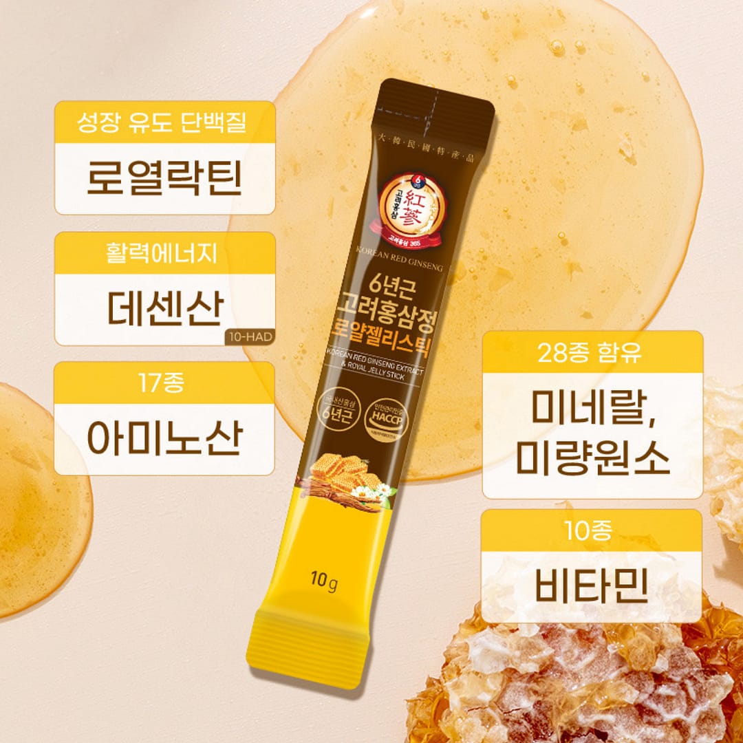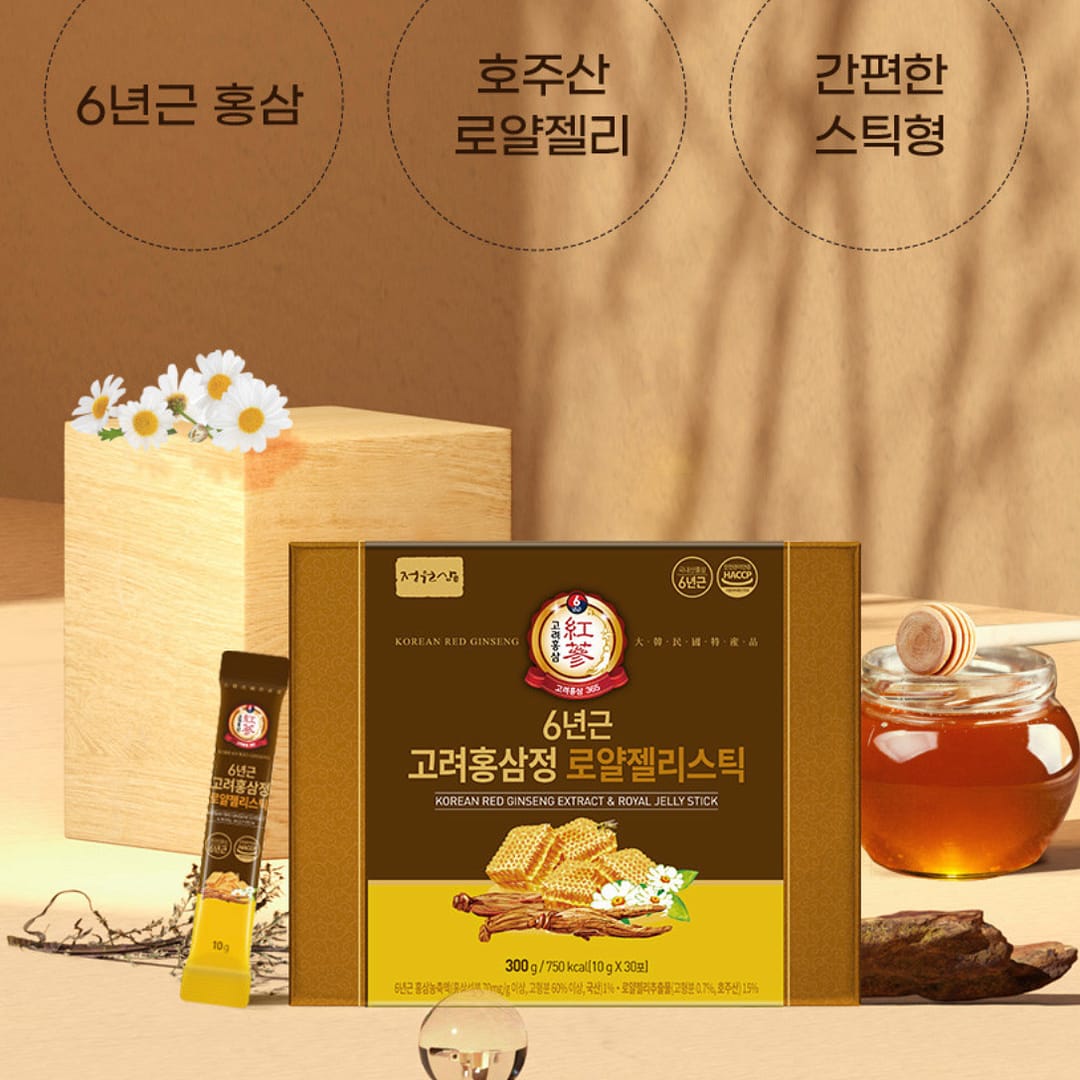 A premium daily stick that pairs 6-year Korean red ginseng with Australian royal jelly extract for a smooth, convenient wellness routine. Each HACCP-certified stick delivers red ginseng concentrate alongside royal jelly and 13 botanical co-ingredients, with a naturally gentle taste and on-the-go stick format.