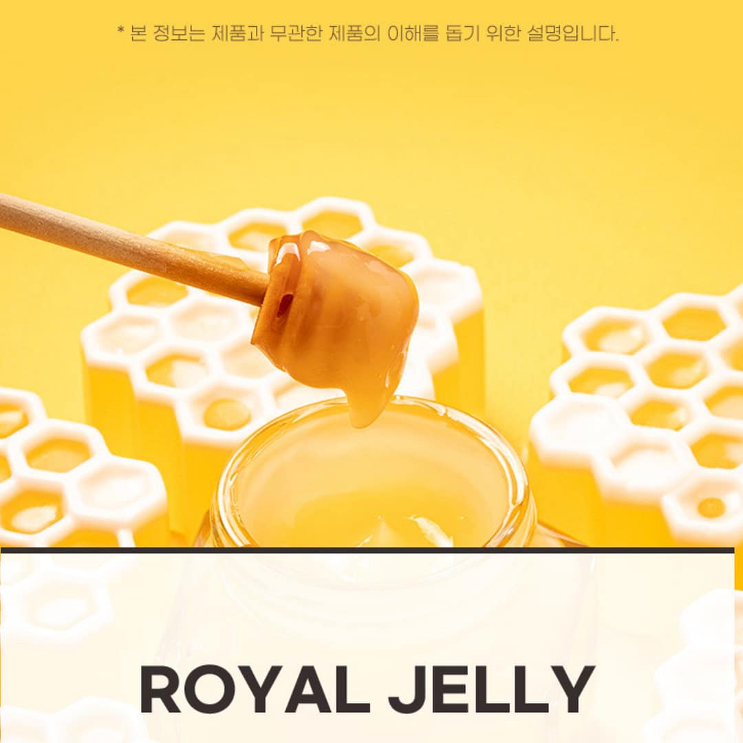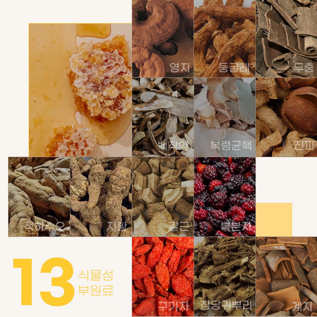 Ingredients: Maltodextrin syrup, fructo-oligosaccharide, royal jelly extract (solids 0.7%, Australia) 15%, plant mixed concentrate {reishi (KR), Solomon’s seal (KR), eucommia, white peony, poria (sclerotium), citrus peel, polygonum multiflorum, rehmannia, kudzu root, Korean black raspberry, goji berry, Korean angelica root, cinnamon twig}, red ginseng concentrate (≥70 mg/g ginsenosides, ≥60% solids, Korea) 1%.